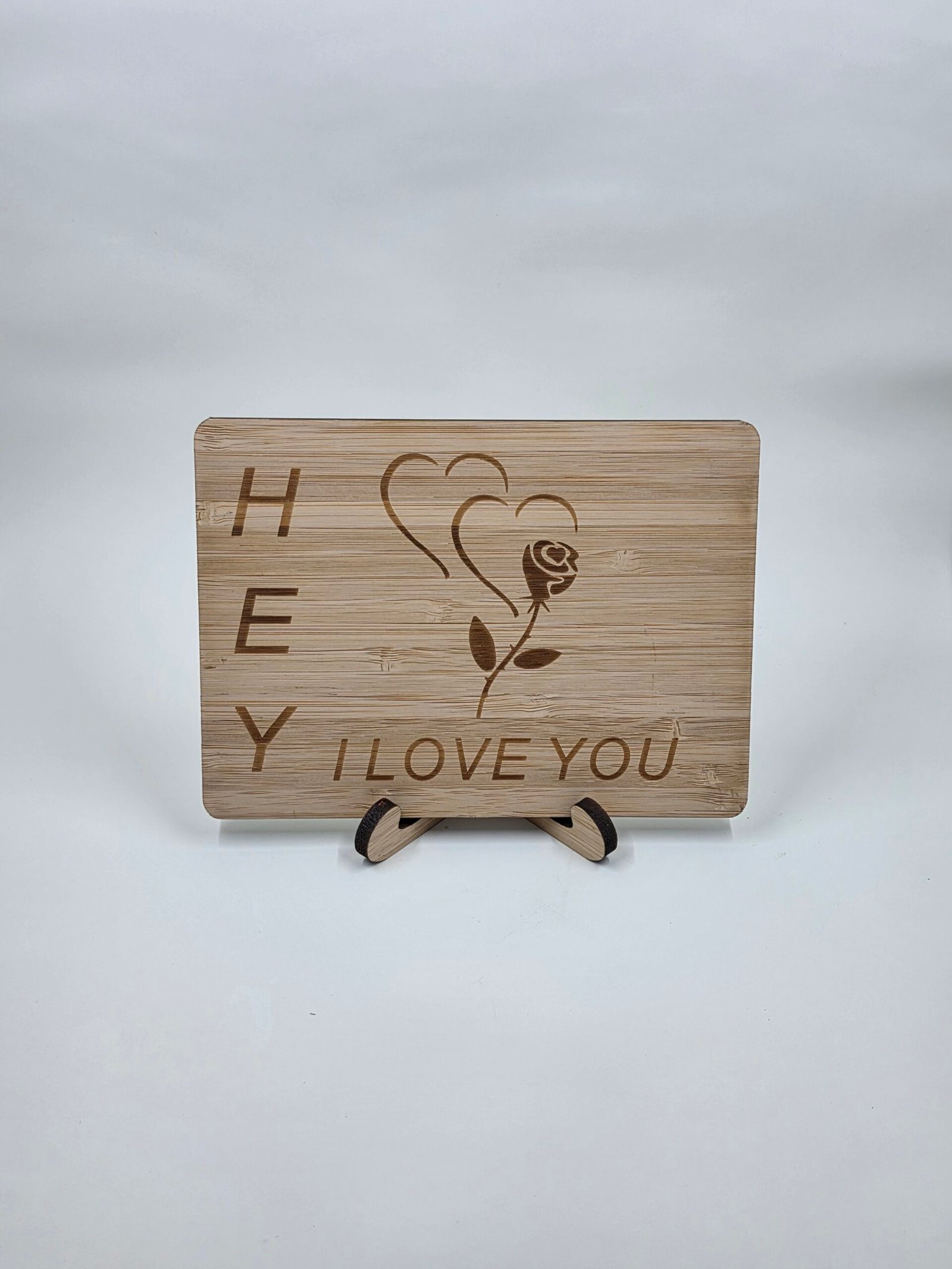 Sometimes the simplest words hit the deepest. The Hey I Love You Wooden Postcard is a handcrafted wooden keepsake designed like a postcard and engraved with a bold message: “Hey, I LOVE YOU.” Finished with a delicate rose and heart detail, it’s a sweet, modern way to say what you mean—without waiting for a special occasion.